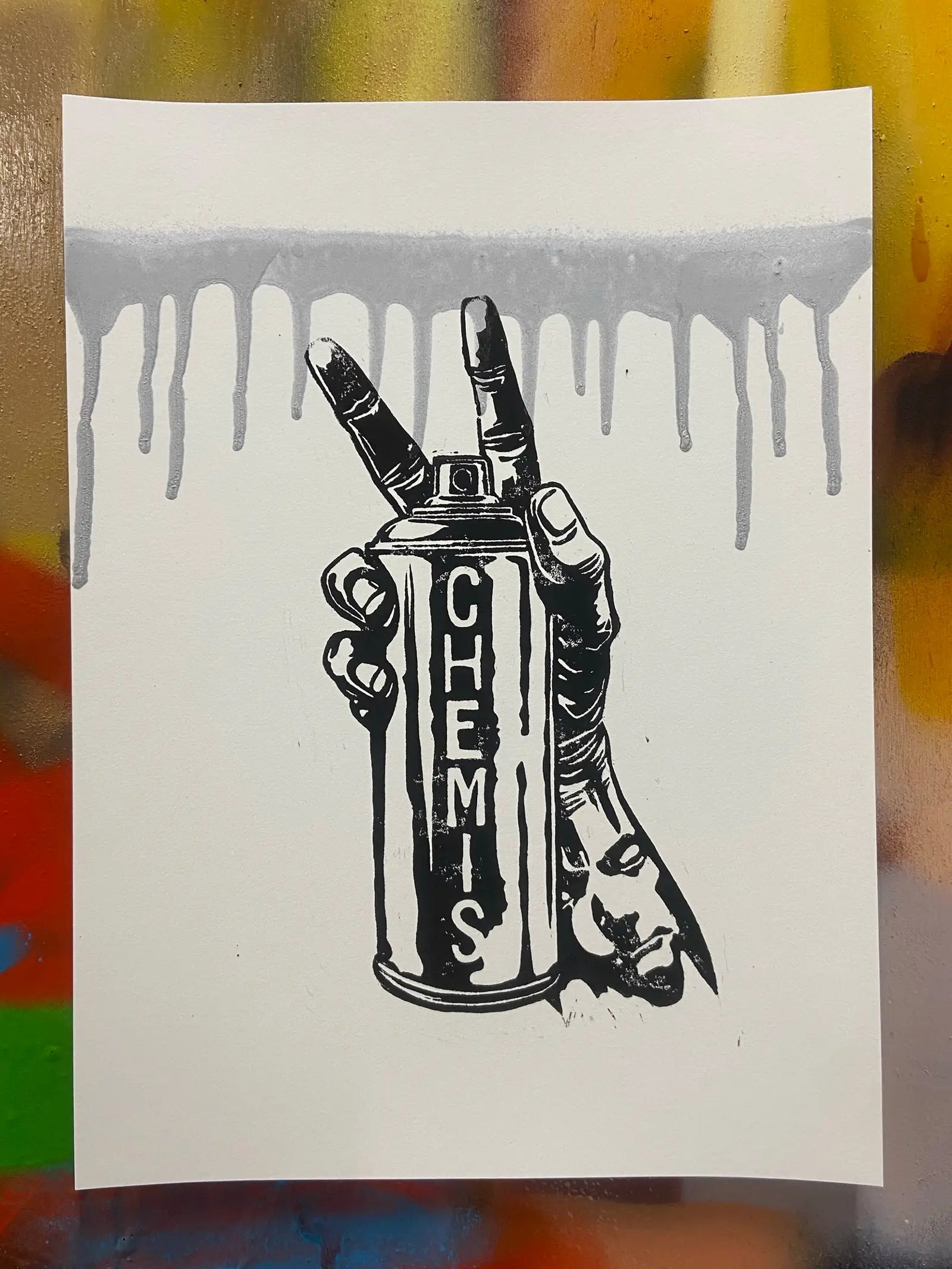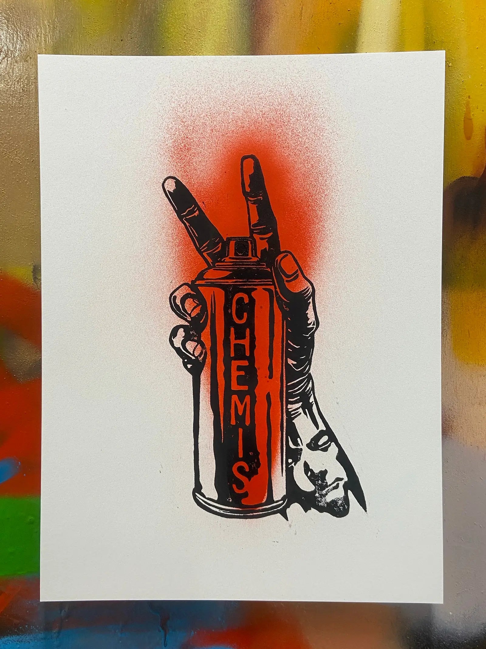 Originální tisk vychází z mojí první šablony ruky se sprejem, kterou jsem vytvořil a používal přes 20 let. Tento redesign znázorňuje moji aktivistickou tvorbu zaměřenou na společenské a environmentální motivy s odkazem na můj první namalovaný portrét z obalu knihy veršů Květy zla od Charlese Baudelairea.